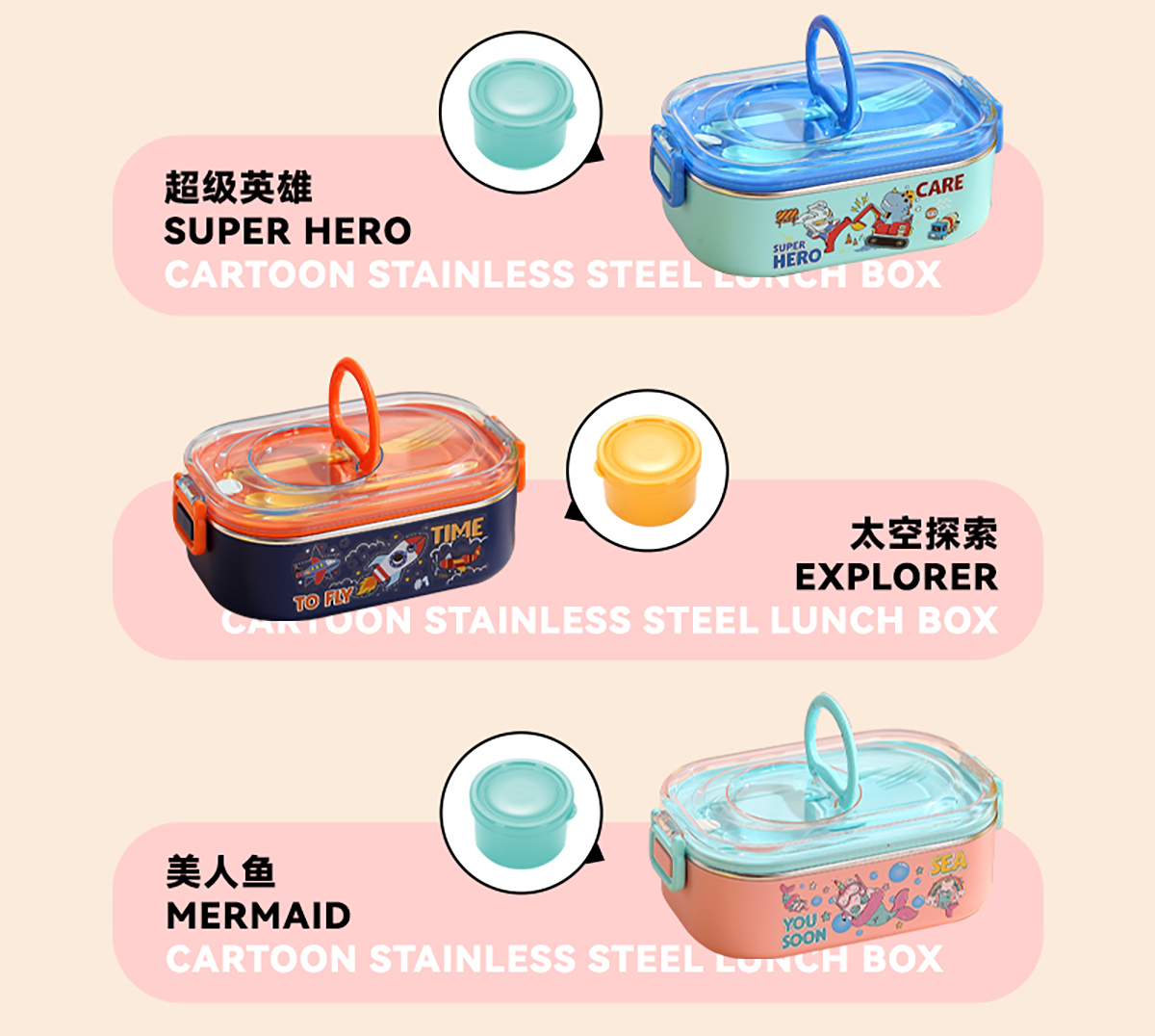 卡通手提密封不銹鋼餐盒(單格900ml/2格850ml+PP碗ml/2格850ml+不銹鋼碗150ml)
